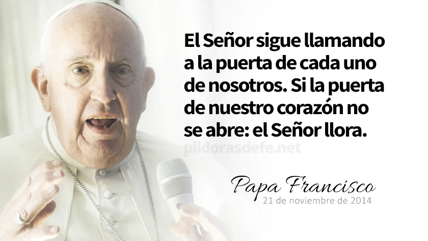 En el Evangelio de hoy, vemos que Jesús llora por Jerusalén, porque no ha reconocido a Aquel que trae la paz. El Señor llora por la cerrazón del corazón de la ciudad elegida, del pueblo elegido. Porque no tenía tiempo de abrirle la puerta. Estaba demasiado ocupada y muy satisfecha de sí misma. Jesús sigue llamando a las puertas, como ha llamado a la puerta del corazón de Jerusalén: a las puertas de sus hermanos, de sus hermanas; a nuestras puertas, a las puertas de nuestro corazón, a las puertas de su Iglesia... El Señor sigue llamando a la puerta, de cada uno de nosotros y de su Iglesia, de los pastores de la Iglesia. Eh sí, la puerta de nuestro corazón, de la Iglesia, de los pastores no se abre: el Señor llora, también hoy. (Homilía del Papa Francisco sobre el Evangelio de hoy)