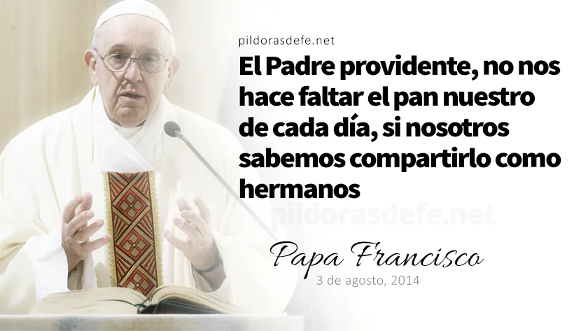 Sobre el Evangelio de hoy, podemos apreciar que Jesús razona de acuerdo a la lógica de Dios, que es aquella del compartir. Cuántas veces nosotros nos damos vuelta hacia otro lado con tal de no ver a los hermanos necesitados. Y esto, mirar hacia otro lado, es un modo educado de decir con guantes blancos: "arréglenselas solos". Y esto no es de Jesús: esto es egoísmo. Si Jesús hubiese despedido a la gente, muchas personas se habrían quedado sin comer. En cambio, aquellos pocos panes y pescados, compartidos y bendecidos por Dios, fueron suficientes para todos. Y atención, ¿eh?: no es una magia, es un signo. Un signo que invita a tener fe en Dios, el Padre providente, que no nos hace faltar el pan nuestro de cada día, si nosotros sabemos compartirlo como hermanos... (Homilía del Papa Francisco sobre el Evangelio de hoy, 3 de agosto, 2014)