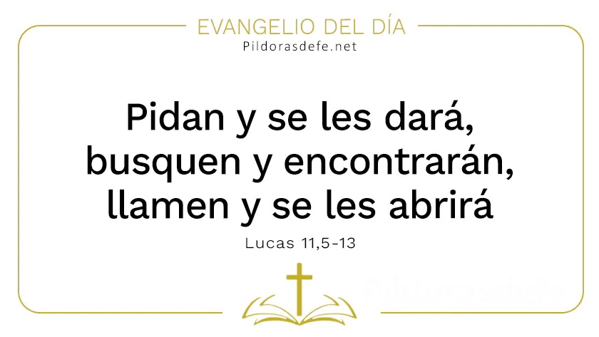 ¿Qué me dice este texto del Evangelio del día? Escribe en los comentarios las peticiones que el Evangelio de hoy jueves haya podido suscitar en ti. Mensaje del Evangelio del día, según San Lucas 11,5-13: "Pidan y se les dará, busquen y encontrarán, llamen y se les abrirá". Hoy, se nos invita a orar con confianza y perseverancia, sabiendo que Dios escucha siempre, aunque a veces su respuesta no coincida con lo que esperamos. Estaremos orando por tus intenciones.