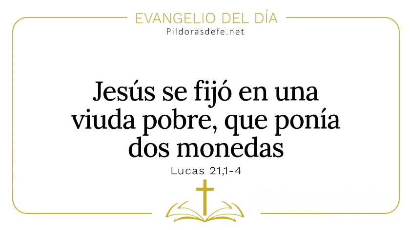 ¿Qué me dice este texto del Evangelio del día? Escribe en los comentarios las peticiones que el Evangelio de hoy lunes haya podido suscitar en ti. Mensaje del Evangelio del día, según San Lucas 21,1-4: "Vio a una viuda pobre, que ponía dos pequeñas monedas". Hoy, se nos invita a vivir la generosidad desde el corazón, a no medir nuestras acciones por la cantidad, sino por el amor que las inspira. Estaremos orando por tus intenciones.