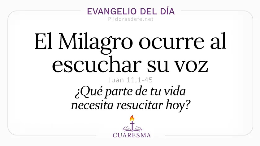 Durante este Quinto Domingo de Cuaresma, el Señor nos llama a renovar nuestra confianza en su poder salvador. Así como Jesús llegó a Betania en el momento más crítico, también llega a nuestra vida en los momentos más difíciles. Él no se queda en la distancia, sino que se acerca, nos llama por nuestro nombre y nos invita a salir de aquello que nos mantiene encerrados. Este pasaje también nos invita a escuchar la voz de Cristo con fe. Muchas veces podemos estar tan acostumbrados a nuestras situaciones que dejamos de creer que algo puede cambiar. Sin embargo, la palabra de Jesús tiene poder para renovar todo. (Redacción: Grupo de Evangelización de Pildorasdefe.net, 22 de marzo de 2026)