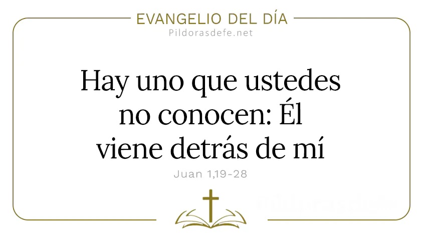 ¿Qué me dice este texto del Evangelio del día? Escribe en los comentarios las peticiones que el Evangelio de hoy viernes haya podido suscitar en ti. Mensaje del Evangelio del día, según San Juan 1,19-28: "Hay uno que ustedes no conocen: Él viene detrás de mí". Hoy, se nos invita a preguntarnos desde dónde vivimos nuestra fe: si desde el deseo de ser reconocidos o desde la humildad del servicio. Estaremos orando por tus intenciones.