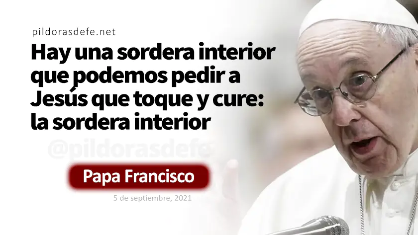 El Evangelio de hoy nos dice que el Señor realiza este signo prodigioso. Llevó aparte al sordo, le metió el dedo en los oídos y le tocó la lengua con saliva. Luego miró al cielo, gimió y le dijo: "Effetá", es decir, "¡Ábrete!". (Cf. Mc 7,33-34)... Ese hombre era incapaz de hablar porque no podía oír. Para curar la causa de su enfermedad, Jesús, de hecho, puso sus dedos en primer lugar en los oídos del hombre, luego en su boca, pero primero en sus oídos... Todos tenemos oídos, pero muy a menudo no somos capaces de oír. ¿A qué se debe esto? Hermanos y hermanas, hay una sordera interior que hoy podemos pedir a Jesús que toque y cure. Es la sordera interior, que es peor que la sordera física, porque es la sordera del corazón... Hoy, como el día de nuestro Bautismo, escuchamos las palabras de Jesús dirigidas a nosotros: "¡Efatá, ábrete!". Abre tus oídos. Jesús, quiero abrirme a tu Palabra; Jesús, ábreme a escucharte; Jesús, sana mi corazón de la cerrazón, sana mi corazón de la prisa, sana mi corazón de la impaciencia... (Homilía del Papa Francisco sobre el Evangelio de hoy)